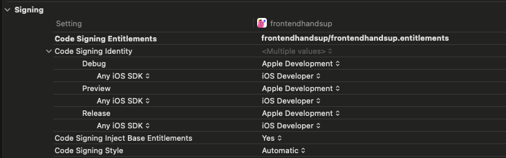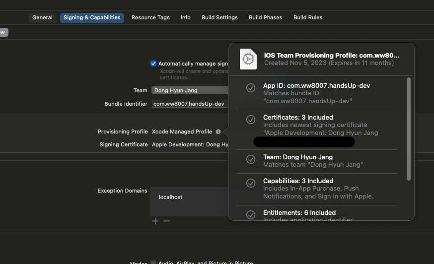앱을 빌드할 때 Apple Development 인증서를 통해서 안전하다는 증명을 하는데