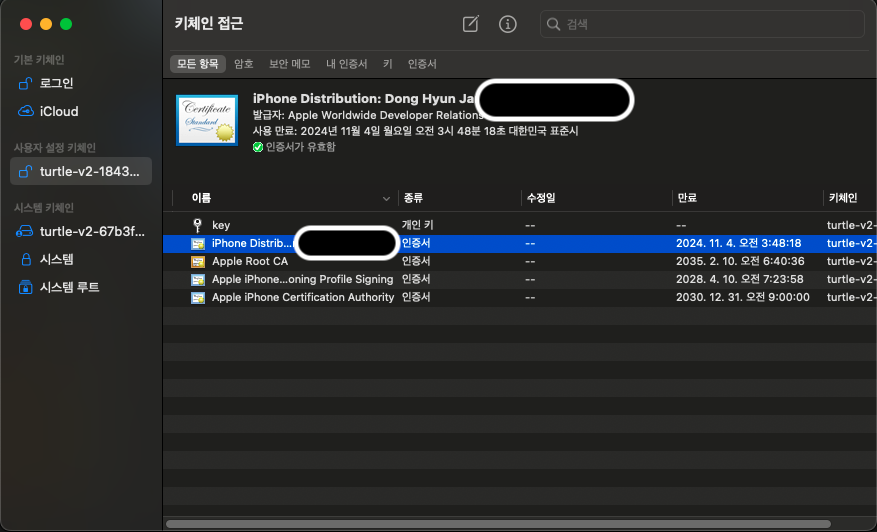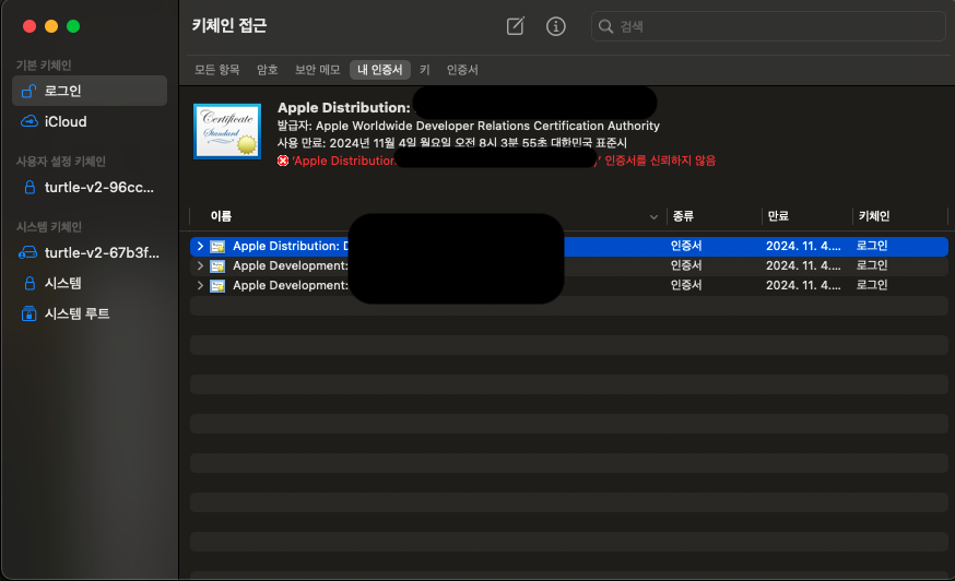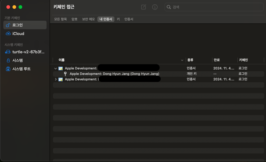 mac의 키체인에 잠시 인증서가 생기는 것을 확인할 수 있습니다.