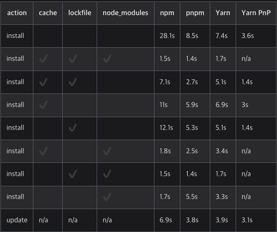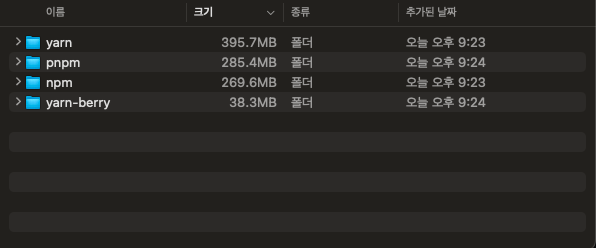 yarn > pnpm > npm > yarn berry 순으로 용량에 차이가 있는 걸 확인할 수 있습니다.